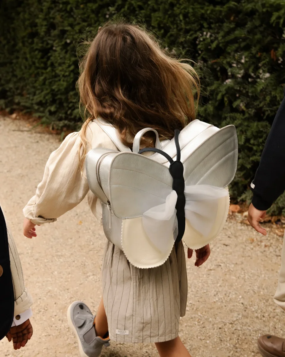 The perfect first schoolbag! The Alja Schoolbag is not only roomy to accommodate all the school essentials but also irresistibly cute, thanks to a unique Donsje design. The tulle details and metallic leather sides add charm to the butterfly design. With dimensions of 25 cm x 30 cm x 10 cm, adjustable leather straps and zip closure along the top, it’s as practical as it is adorable.