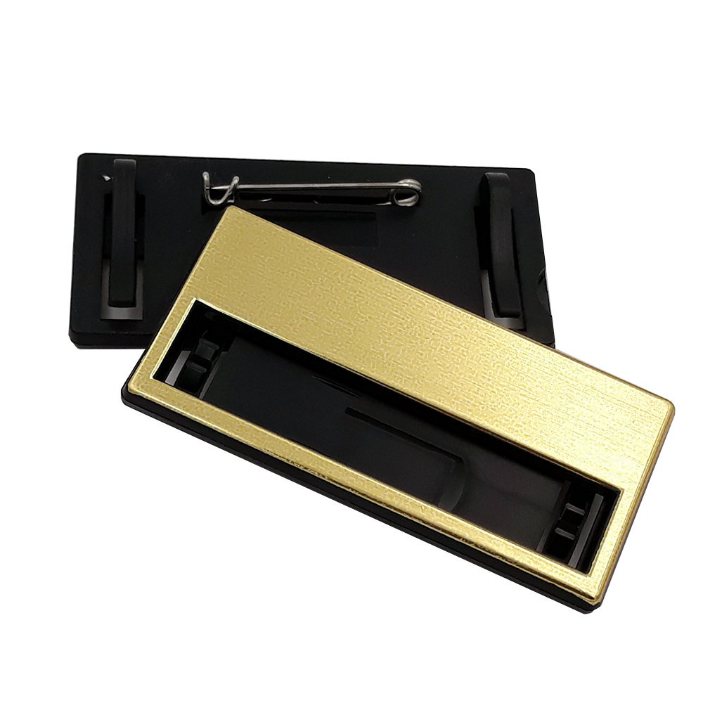 Référence produit : APA-BP-006 Or Coloris : Or Matière : PVC + Aluminium Fixation: Epingle Dimensions : 68 x 33mm