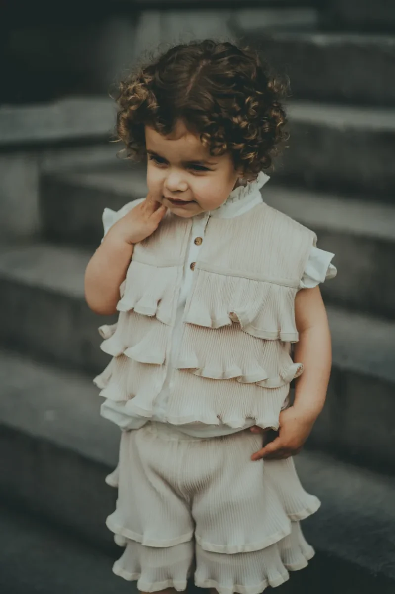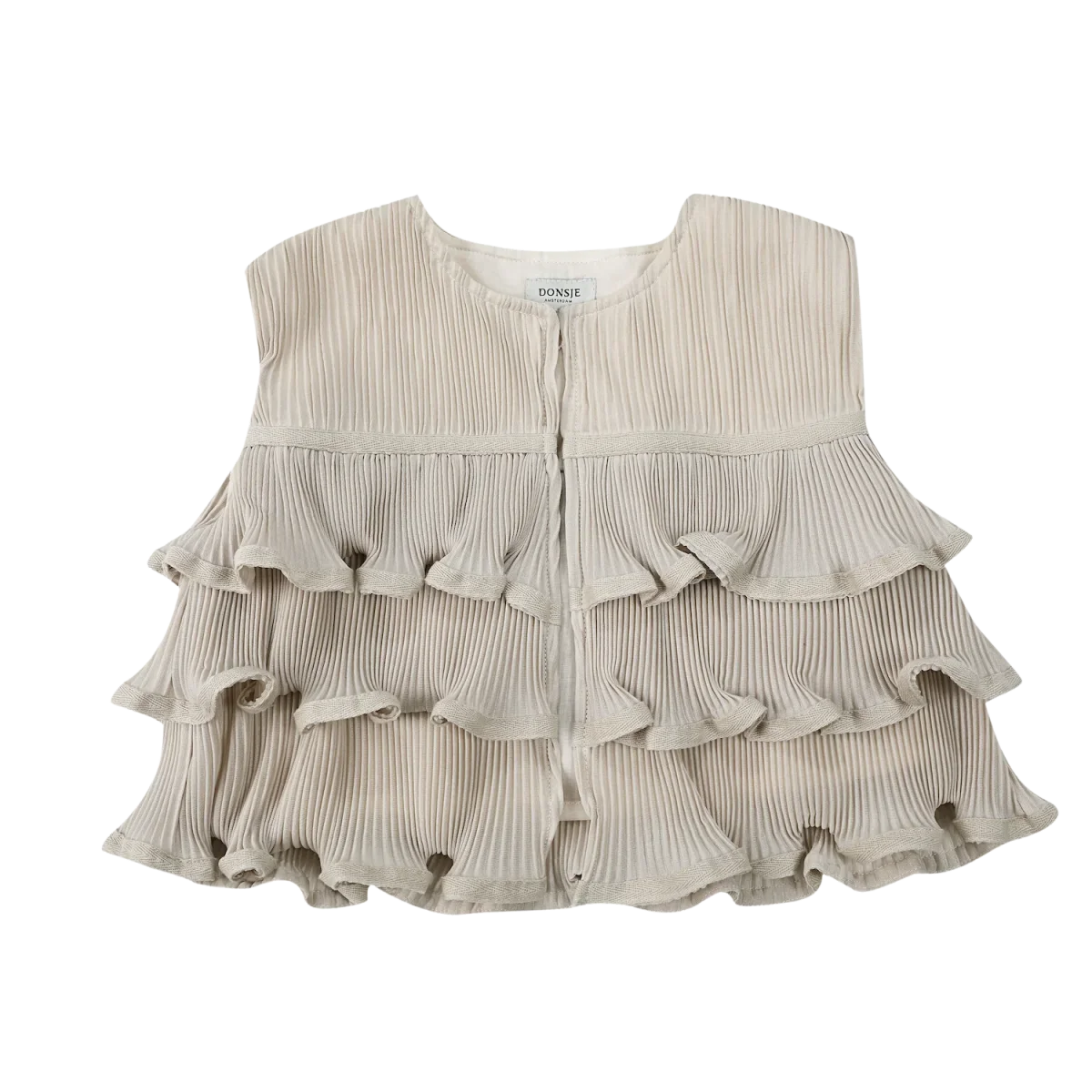 Lovely and free! Enjoy the summer freedom in Cette Gilet! Thanks to a beautiful layered pleated design, this gilet will become the season’s favourite. Create an impeccably stylish set with the Zoe Shorts.