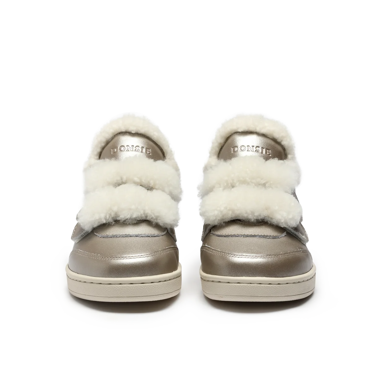 The Hanzell Sneakers bring spring to the steps and a smile to the face. Made from 100% premium metallic leather, featuring easy velcro fastening and with adorable, snowball-like faux fur details, these shoes offer comfort and support for little feet that are so eager to run, jump, hop and explore!
