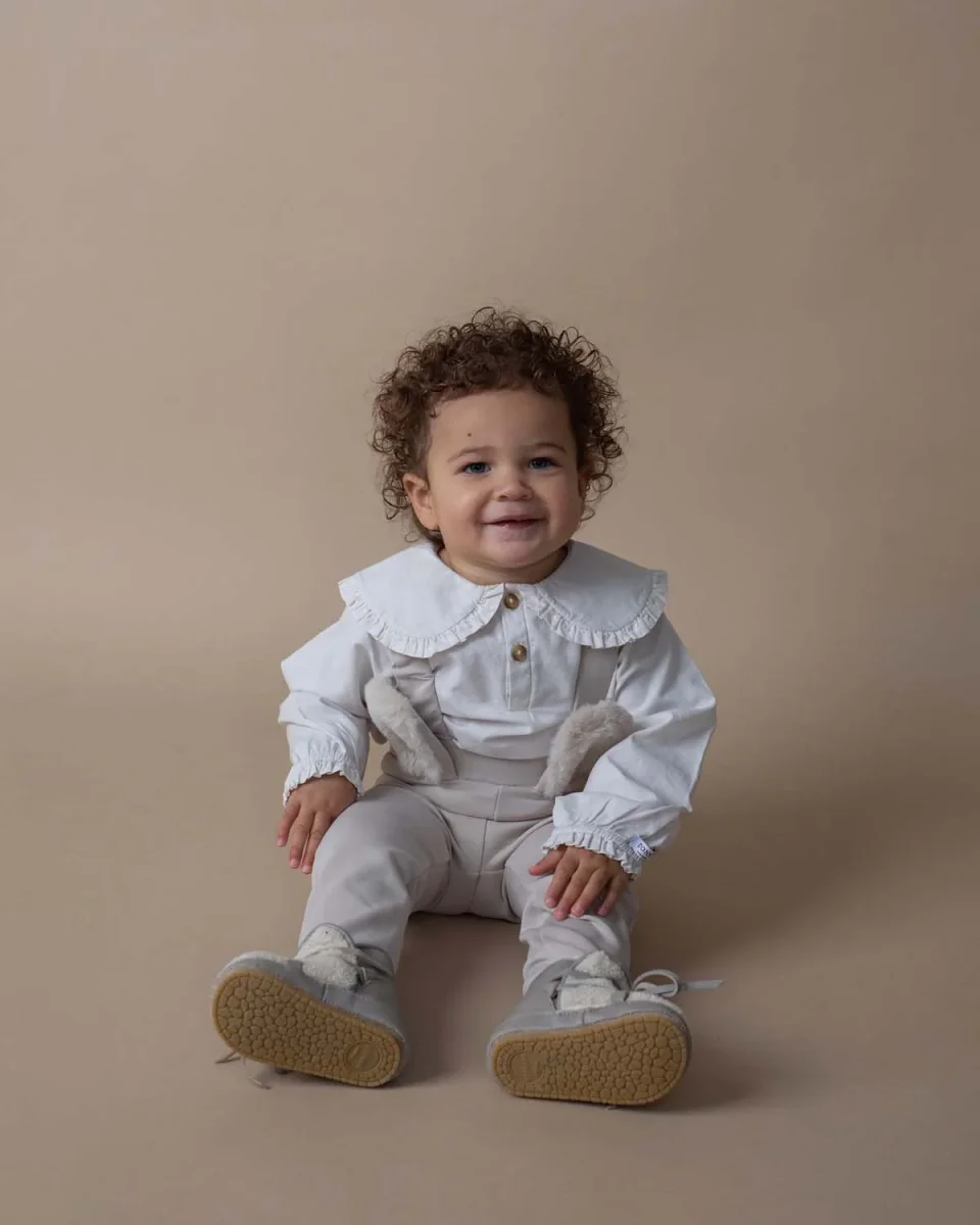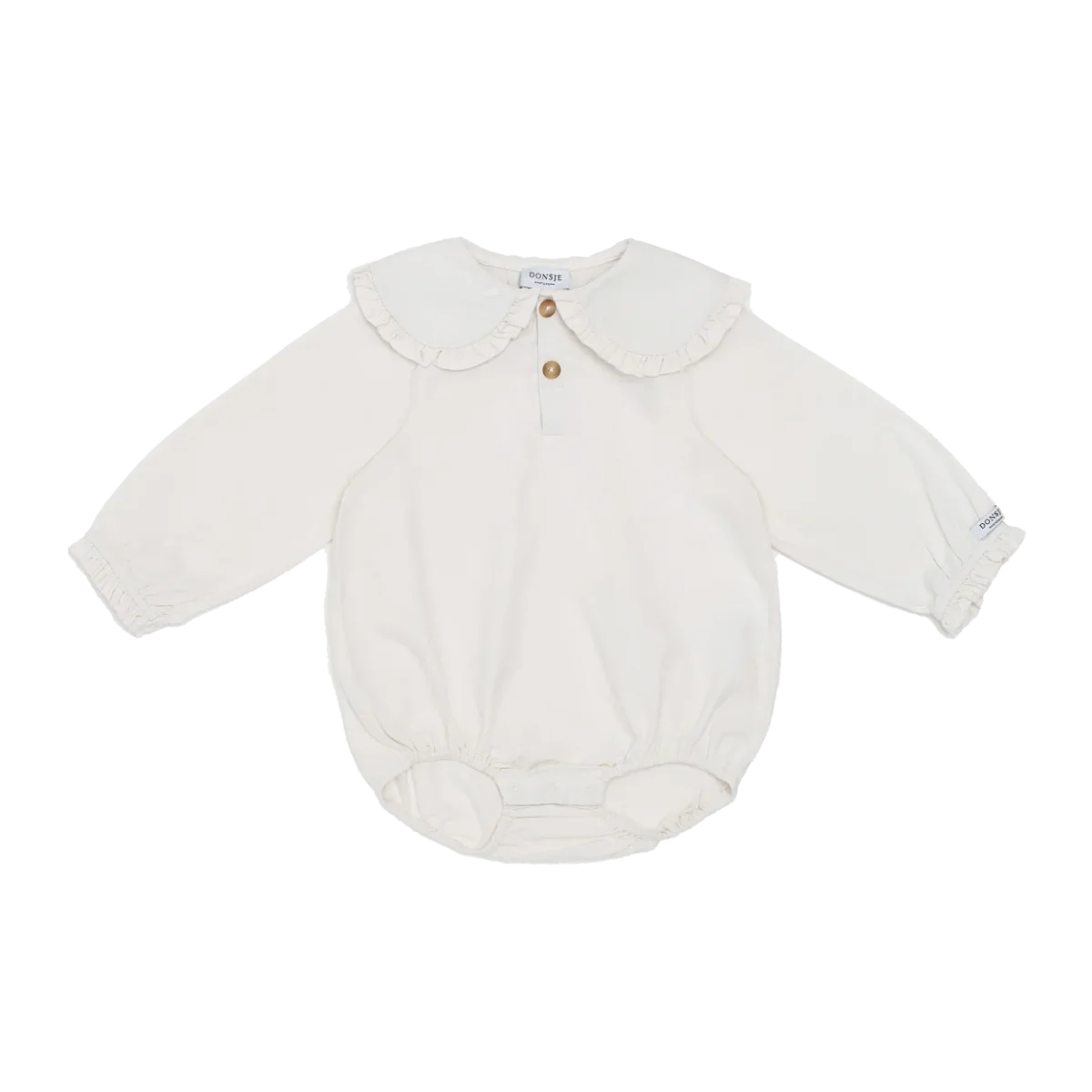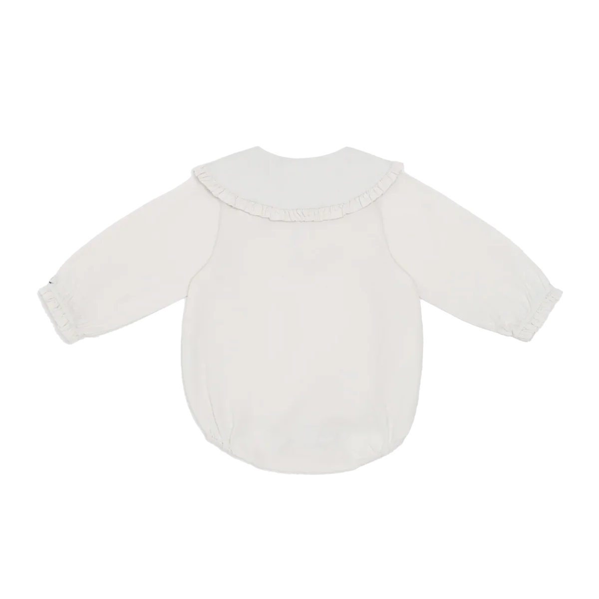 Charming and cute! This easy-to-wear, darling romper with an oversized peter-pan collar offers comfort and style for the winter months. Made from 100% organic cotton, featuring button fastenings along the front, snap fasteners at the bottom, and elasticated sleeve and leg openings for comfort and fit.