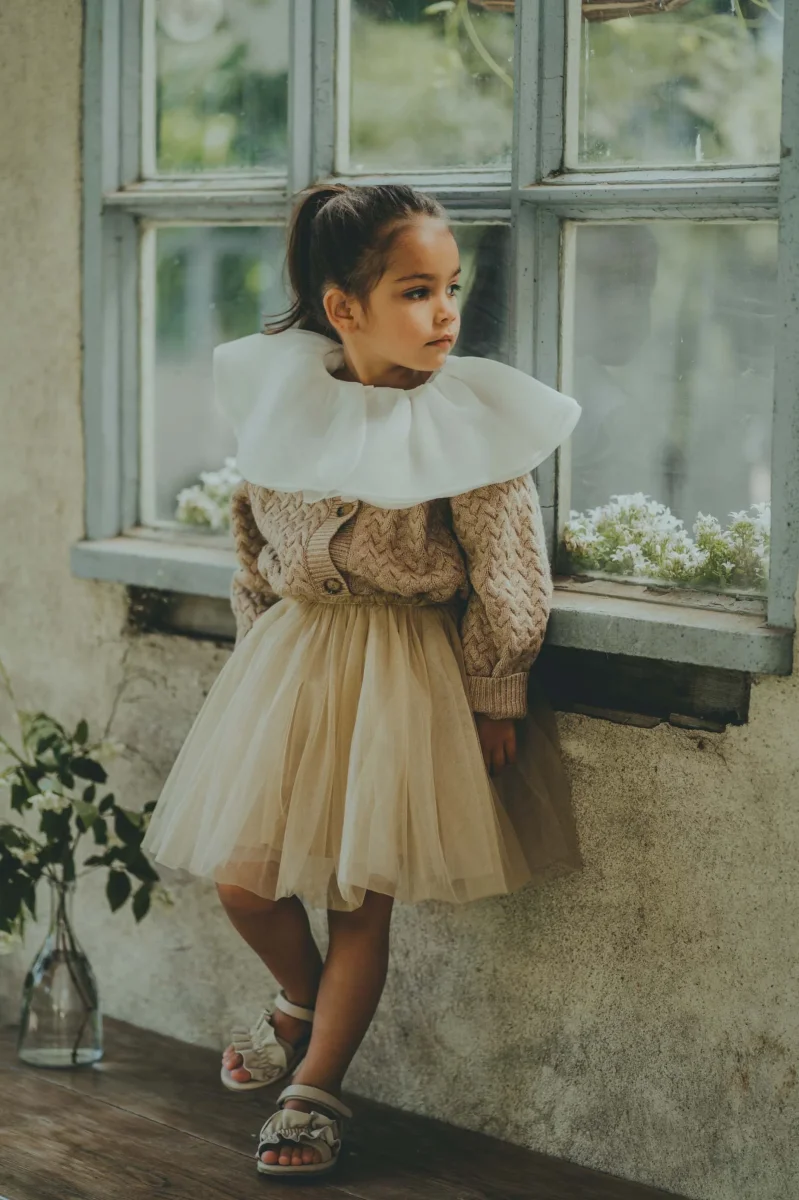 Braids and buttons! The Loena Cardigan is your little one’s ultimate summer layer. Thanks to its beautiful merino wool blend fabric, lovely cable knit design, A-line shape and ribbed hem and cuffs, this sweater will be one to reach out for the summer and beyond.