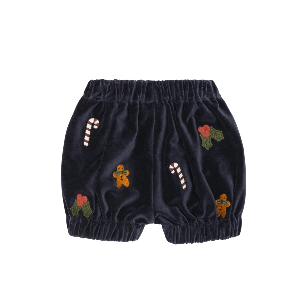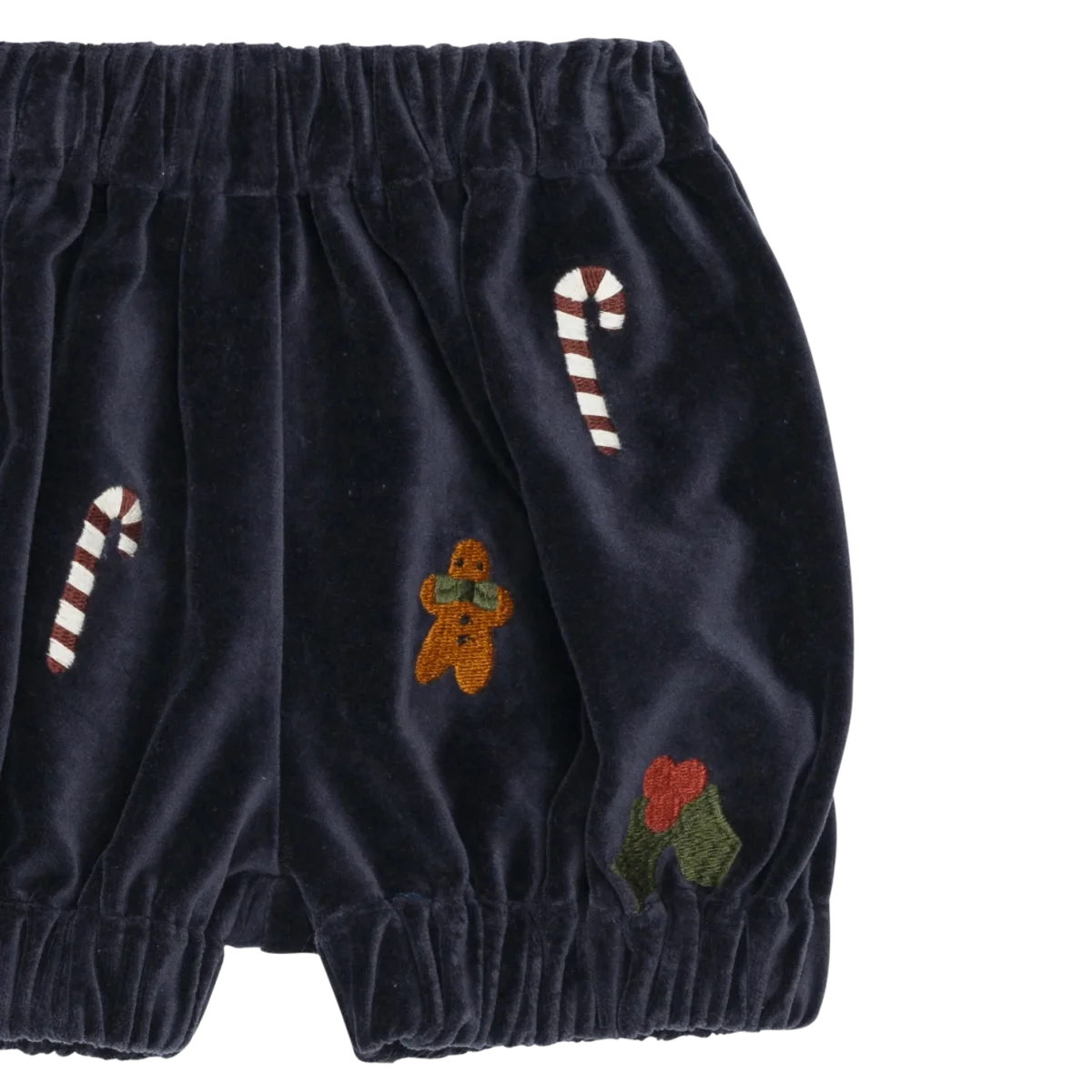 Introducing the delightful Lukasz Bloomers in soft velvet. A stretchy waistband and elastic leg openings ensure comfort and ease when dressing your little one, while the embroidered festive characters add charm.