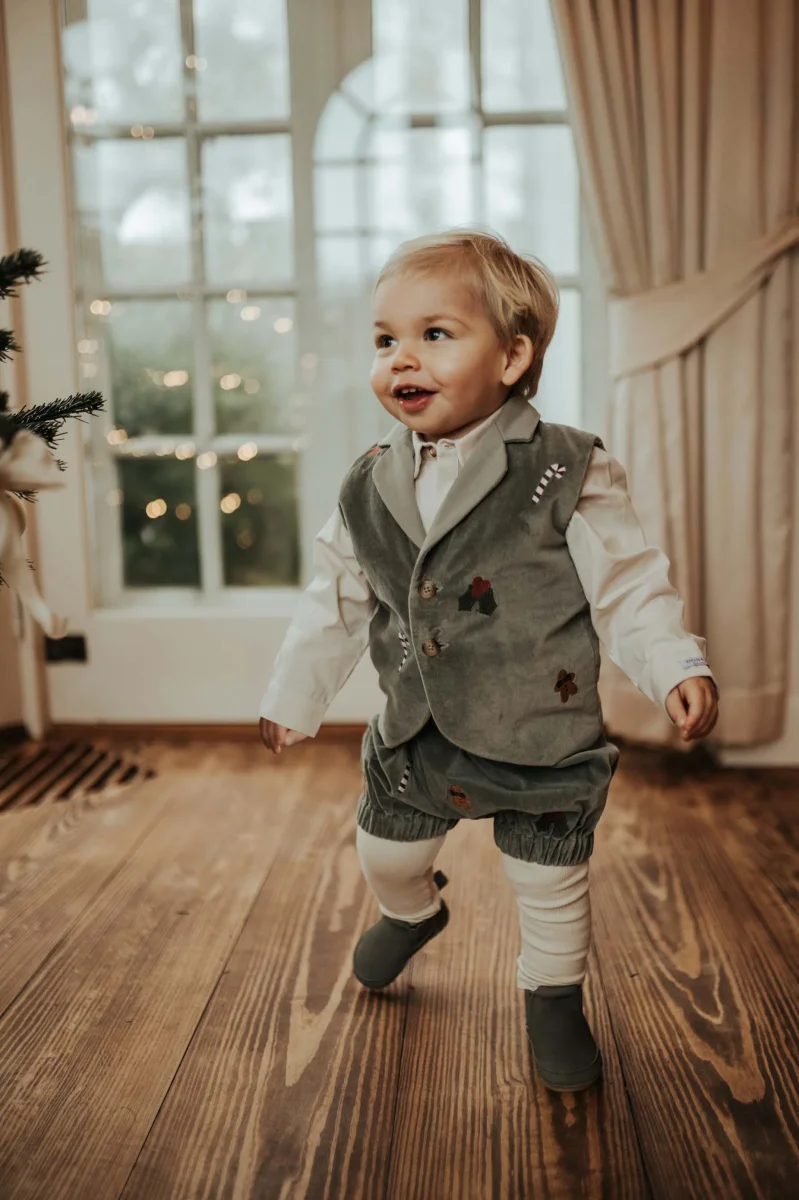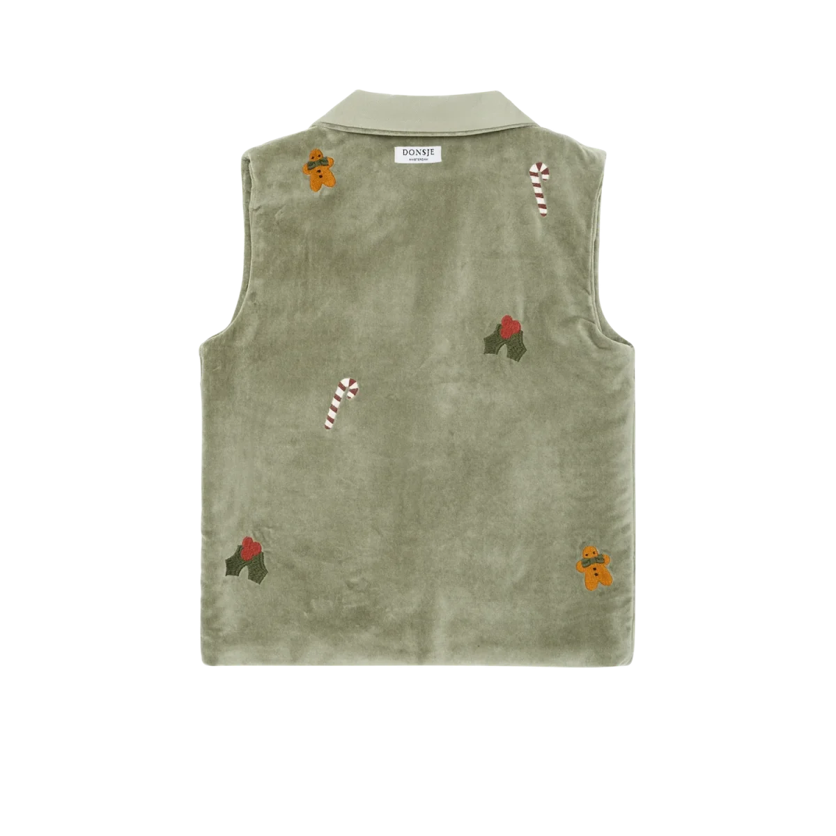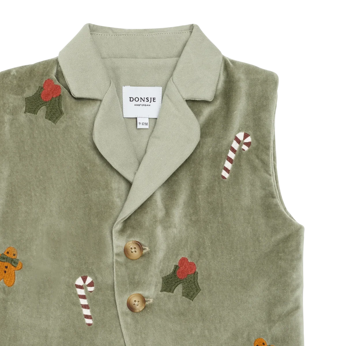 Embrace the festive charm with the sweet and soft Mauck velvet Gilet featuring charming embroidered Donsje embellishments and front button fastenings. A true show stopper, why not pair them with the Lukasz Bloomers for a complete look?