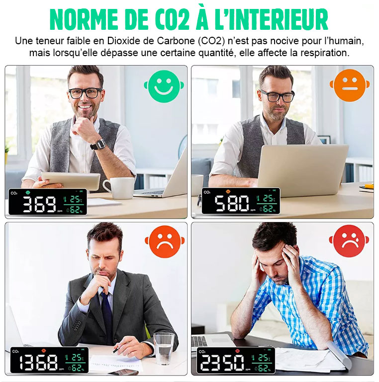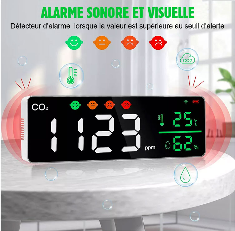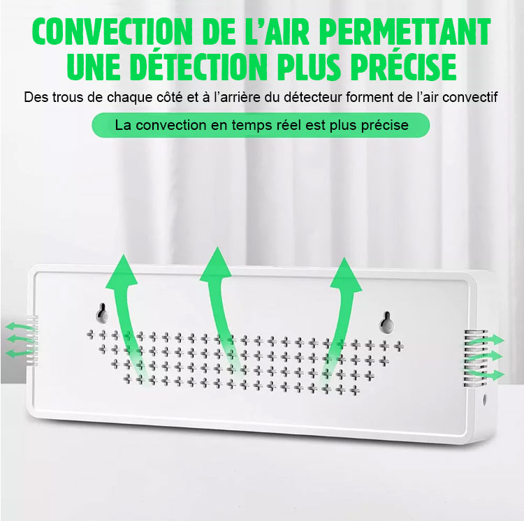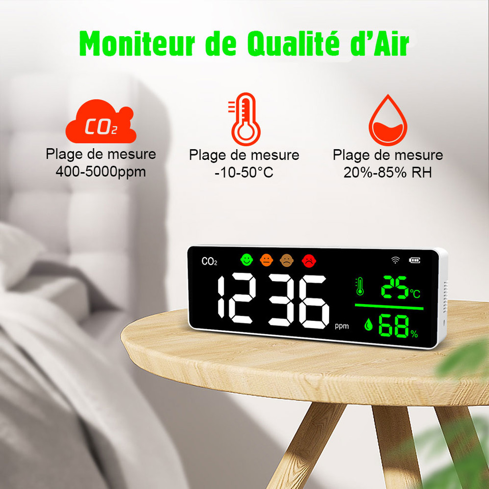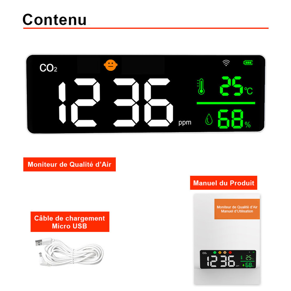 Il est important pour tout le de connaître la qualité de l’air intérieure. Le moniteur de qualité de l’air peut détecter avec précision le CO2, la température et l’humidité présentent dans l’air.