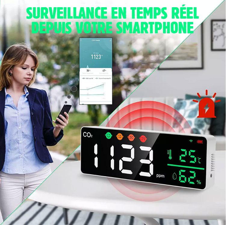 Moniteur de qualité de l’air en temps réel indiquant le CO2, la température et l’humidité qui se trouve dans la pièce.