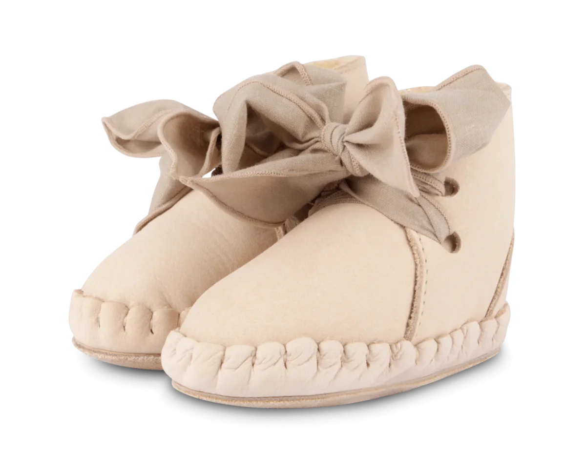 Bows and laces! The Pina Organza Lining shoes are easy to fasten thanks to the beautiful, wide organza laces. Perfect for long-awaited first steps! Made from 100% premium cow leather with a faux fur lining, designed for optimal foot development.