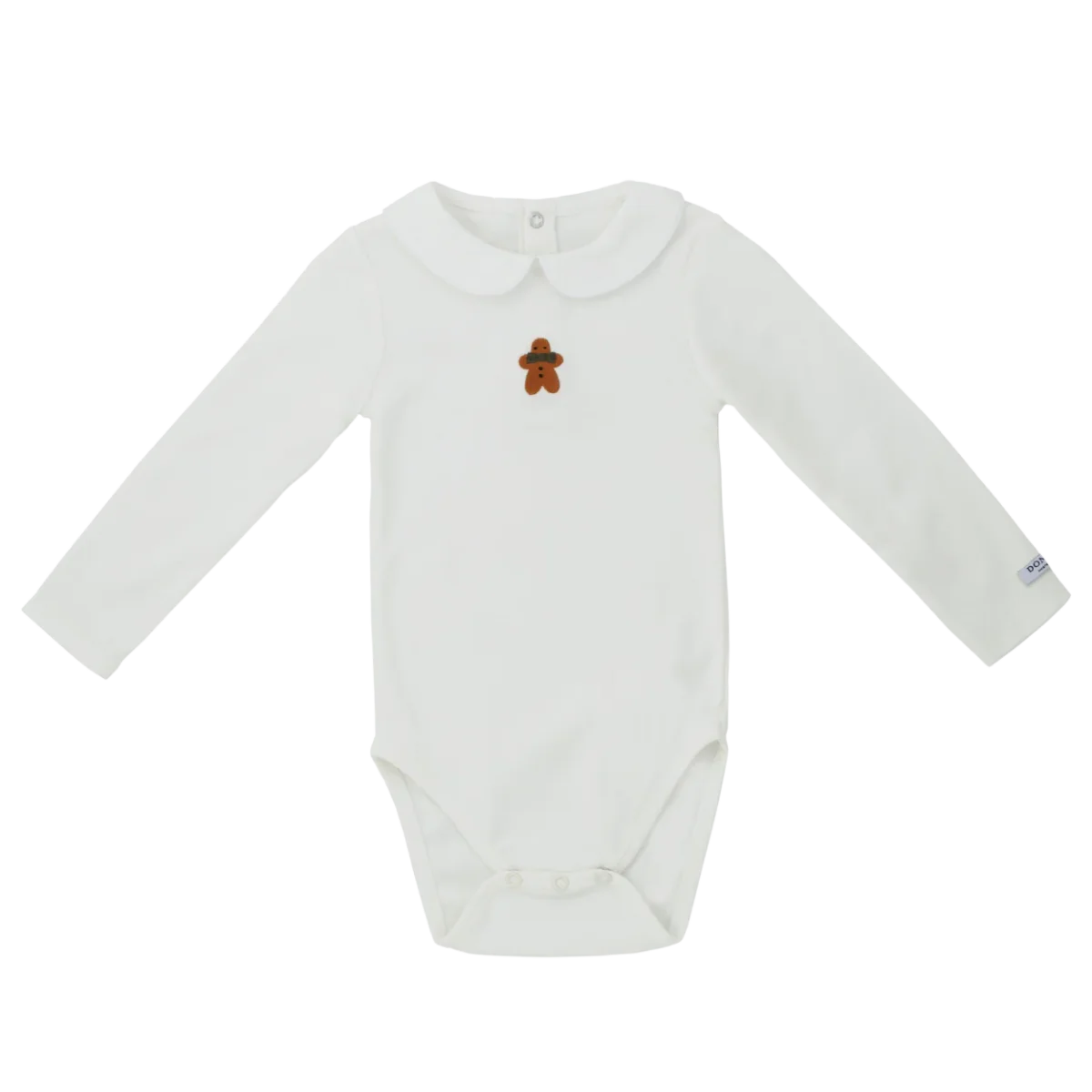 Baby, it’s cold outside! The Kris bodysuit is a charming festive wardrobe essential. The romper features snap fasteners along the back and crotch and a cute Peter Pan collar. A gingerbread embroidered embellishment adds a lovely holiday touch to the item.