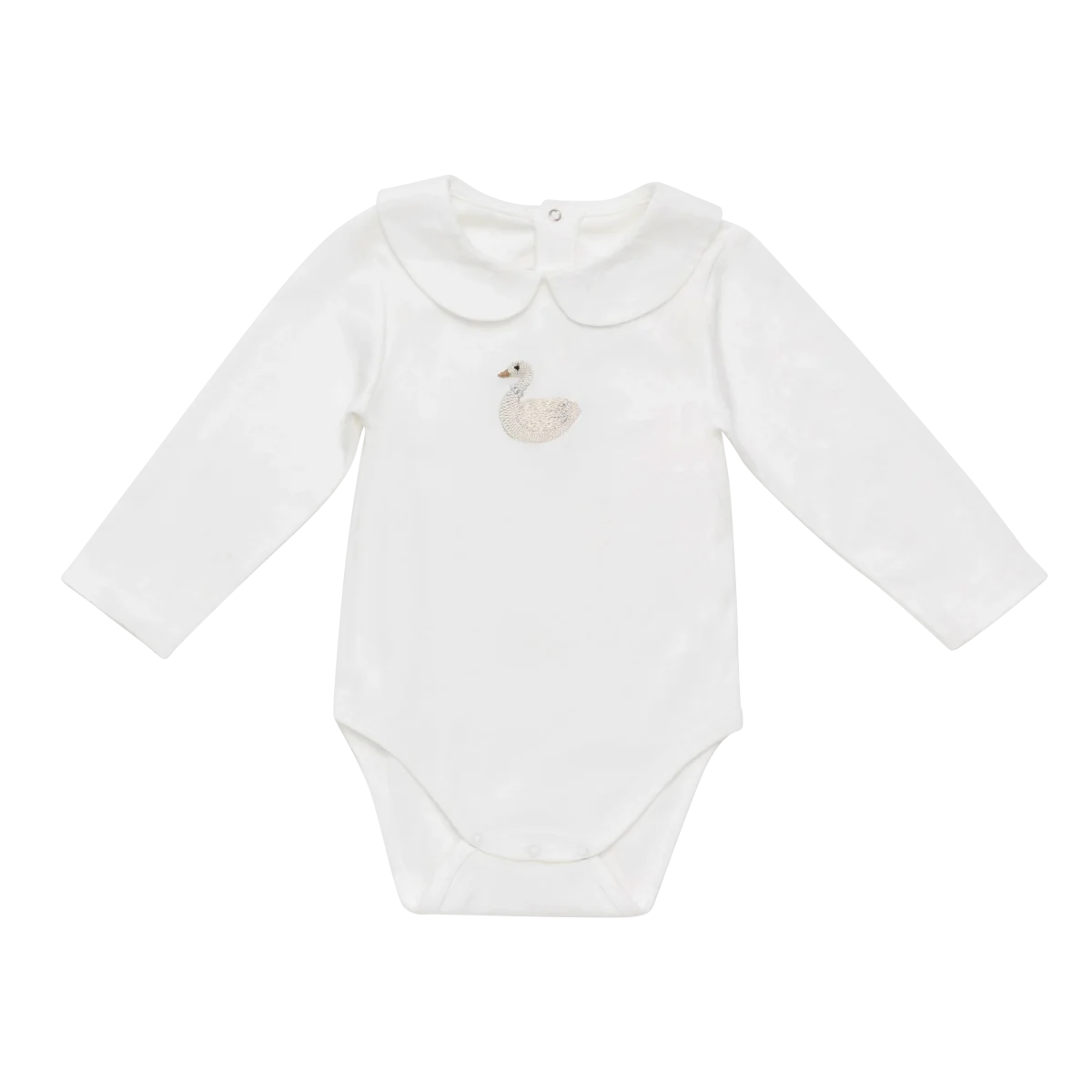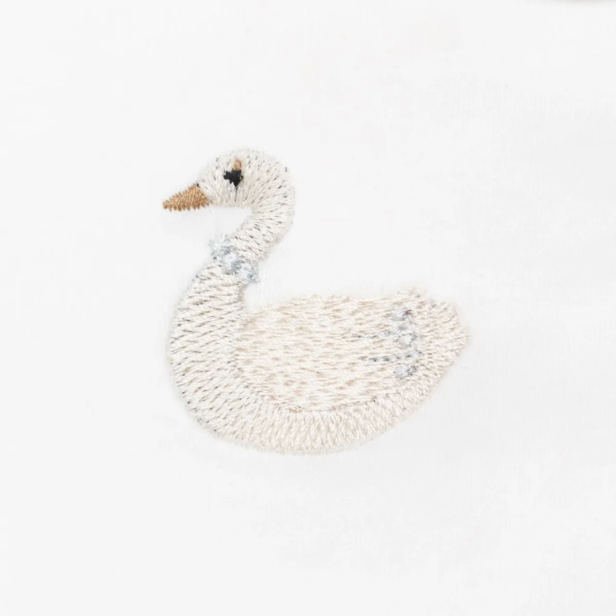 The Shimmer Swan Bodysuit is a perfect mini wardrobe essential, offering a comfortable fit, breathable fabric, and snap fasteners along the back and at the crotch. Adorned with a delicate embroidered swan design, it combines charm and practicality for your little one’s wardrobe.