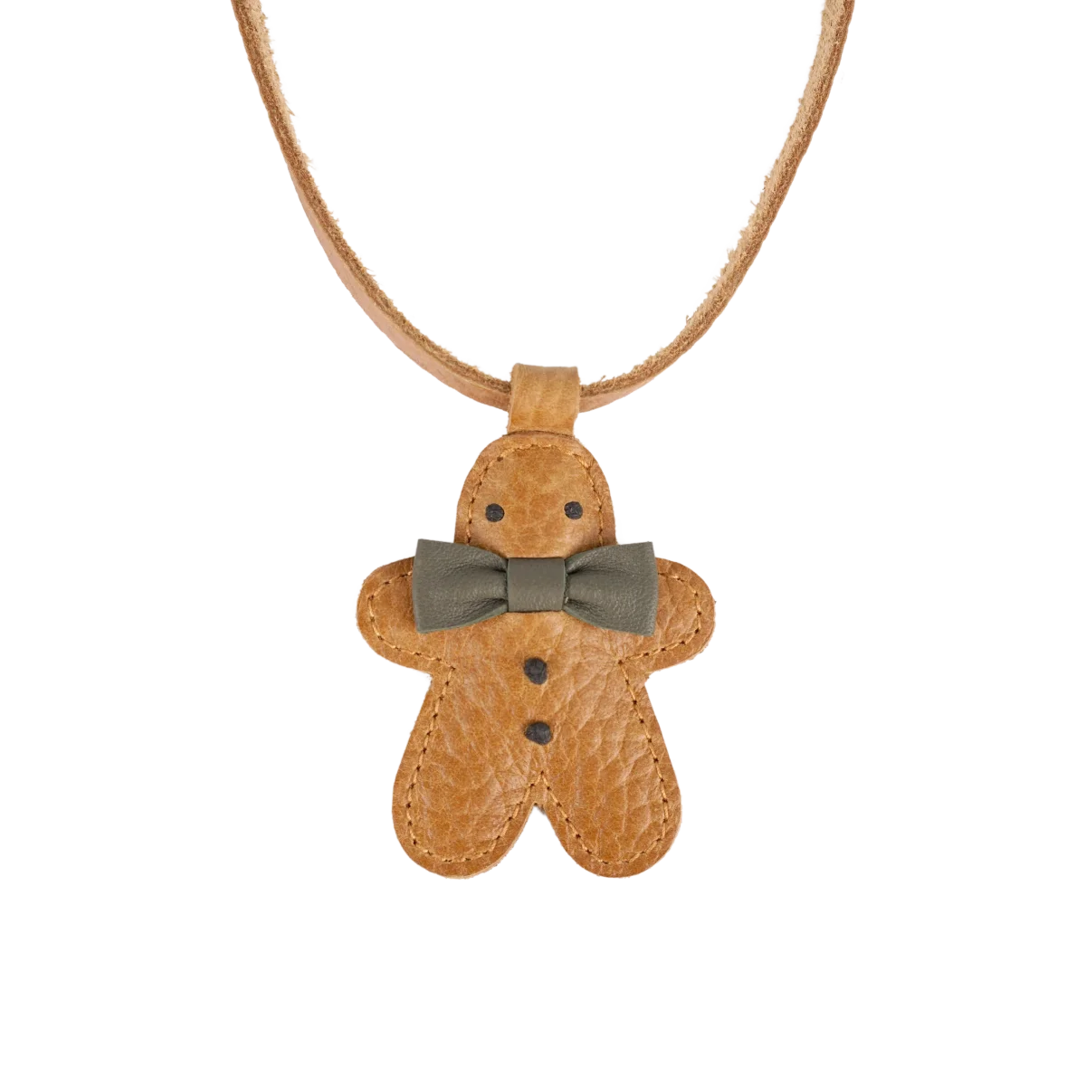 The charm express! The Taaro Necklace featuring a sweet gingerbread character made from leather is a beautiful, festive-inspired accessory for any outfit or occasion. A durable leather fastening keeps this necklace secure.