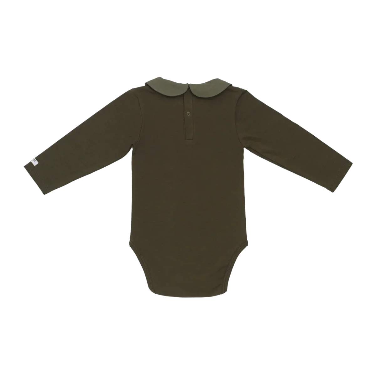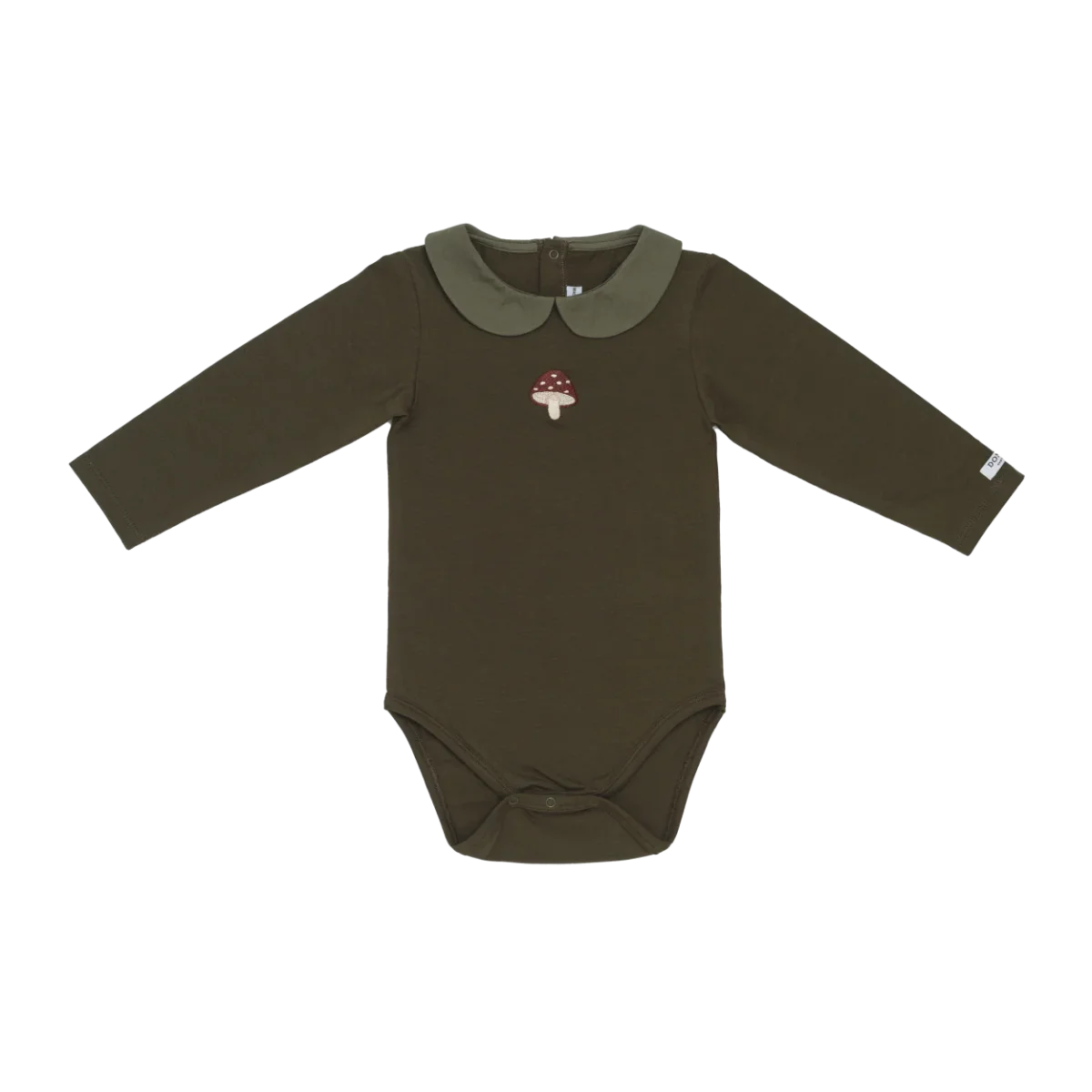 Darling little mushroom! Stay cute in the Voda bodysuit, featuring a cute embroidered toadstool character and a sweet peter-pan collar. Snap fasteners along the back and bottom make it easy to take on and off.